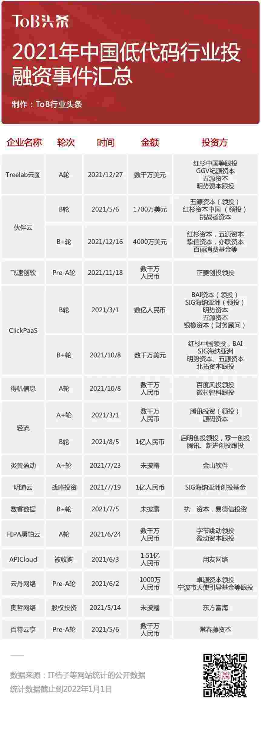到2021年,,无/低代码投融资规模势头更甚,,,其中包括轻流两轮融资(A+轮数千万人民币,,,B轮近亿人民币)、、CGPAY钱包 两轮融资(B轮数亿人民币,,,B+轮数千万美元)、、、百特云享数千万元Pre-A轮融资......